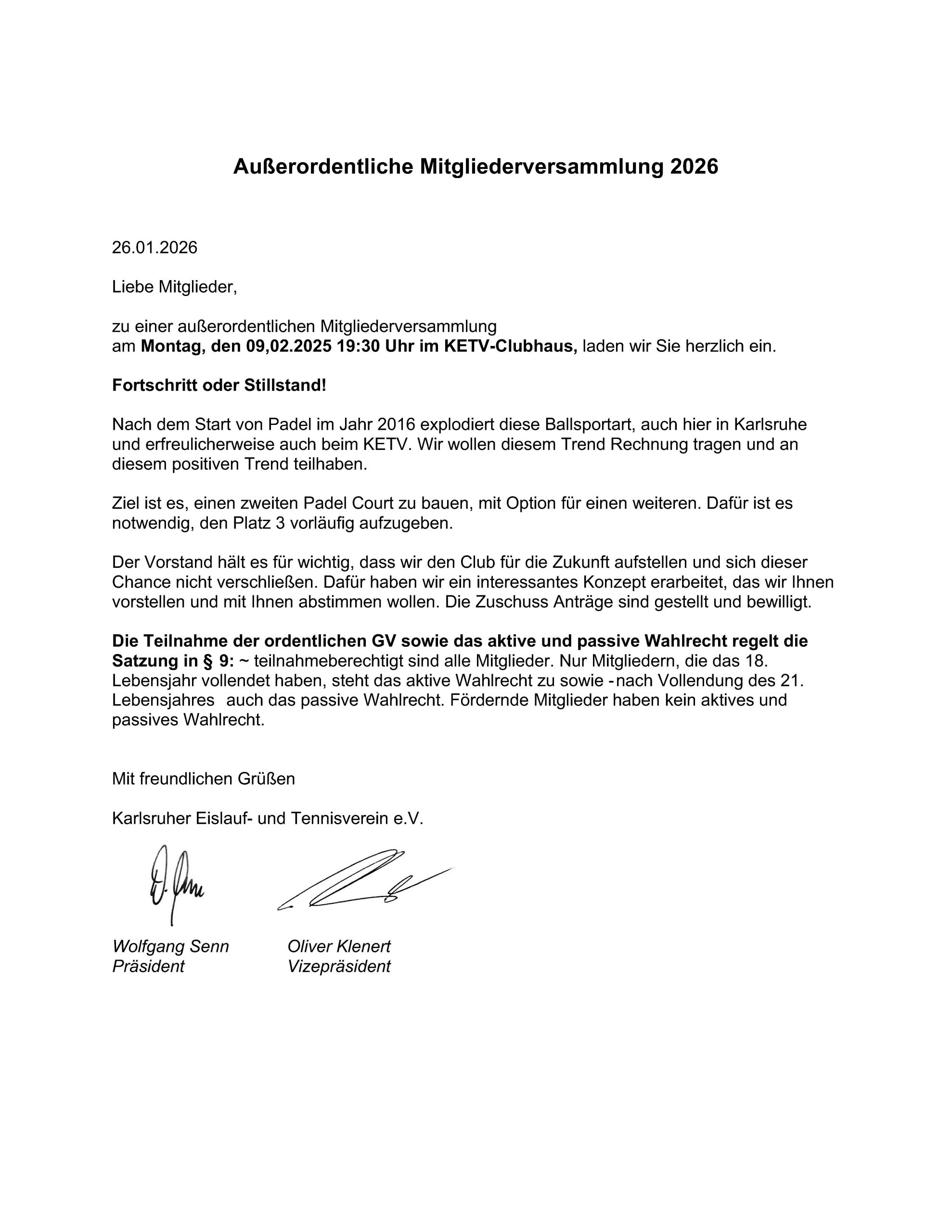 Außerordentliche Mitgliederversammlung, 9. Februar, 19.30 Uhr